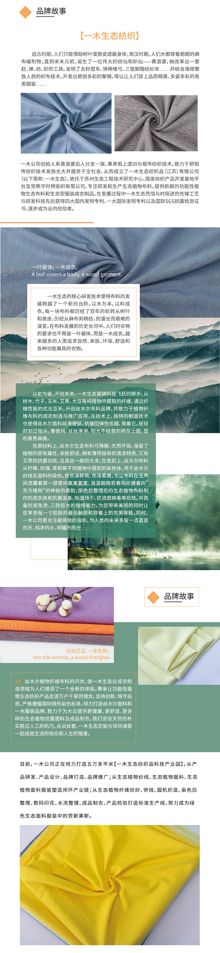 一木生態(tài)紡織產(chǎn)品應(yīng)時代需求以及人們對天然環(huán)保服裝的渴求而誕生公司以蘇州生態(tài)工程技術(shù)研究中心為基地以一木生態(tài)紡織品科技產(chǎn)業(yè)園為依托,以研發(fā)、生產(chǎn)、銷售(電子商務(wù)平臺及跨境電商)新型功能性生態(tài)紡織產(chǎn)品為己任,產(chǎn)品全部采用天絲、莫代爾、竹纖維、玉米纖維、玫瑰、薄荷等新型纖維素纖維(植物纖維)。創(chuàng)新之道,本在惠人,一木人將永遠(yuǎn)秉承歷史寶貴經(jīng)驗,在新的時代與君開創(chuàng)新的紀(jì)元。